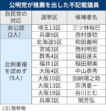 公明党は9日、次期衆院選で自民党の公認候補174人を推薦すると発表した。派閥の政治資金問題で自民党が非公認を決めた埼玉13区の三ツ林裕巳元内閣府副大臣と兵庫9区の西村康稔元経済産業相も推薦した。