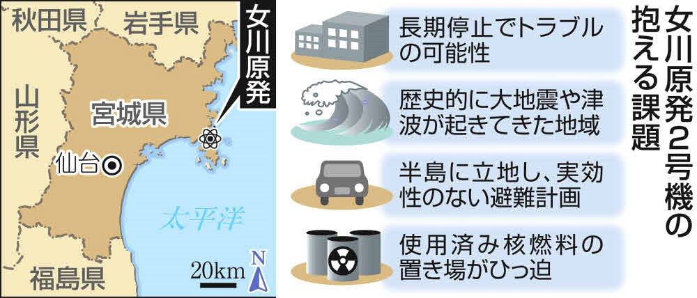 政府の念願だった東日本での再稼働にこぎ着けたが、女川2号機はさまざまな課題を抱えている。原子炉は13年以上使っておらず、長期停止による不具合や設備の劣化が懸念される。東北電さえも、9月に示した文書で「長期停止を経て、温度・圧力や配管内の液体・気体の流れ、振動などにより状態が久しぶりに変化することから、警報や不具合が発生する可能性がある」と認める。◆事故発生なら半島の住民が孤立も